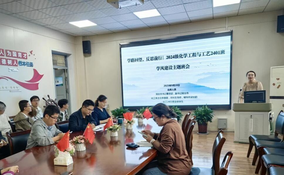 2025年9月18日下午,化学工程与工艺2401班学风建设主题班会在学院会议室举行。党总支书记曹贤姿、副书记程全伟、化工系主任李蓓蓓、本科生导师代表、辅导员梁如韵及化工2401班全体学生参加会议。本次班会旨在总结班级近期情况,分析现存问题,分享学习经验,凝聚师生力量,共同推动班级学风建设迈向新台阶。